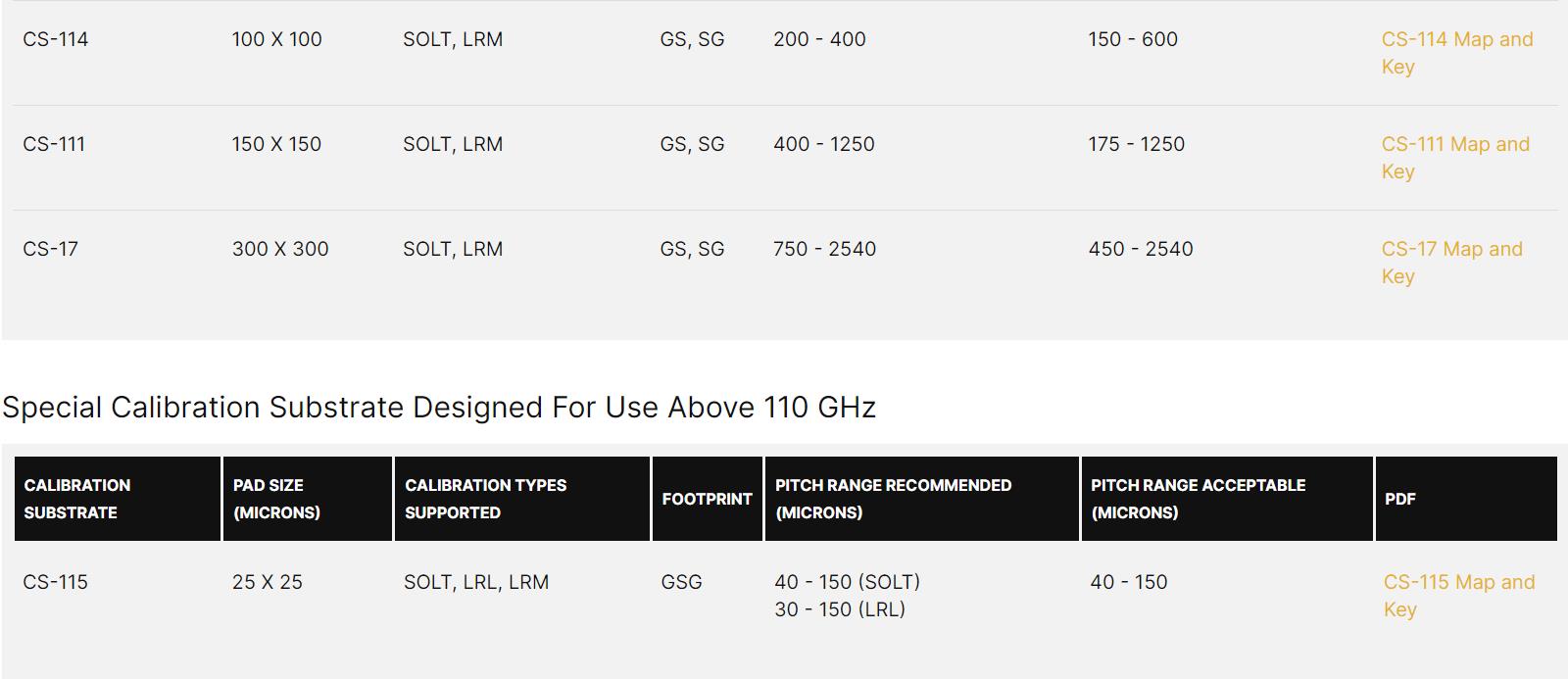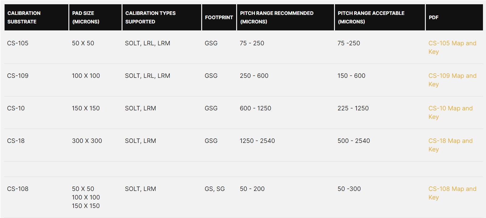 Our accurate, easy to use calibration substrates, calibration coefficients, and detailed instructions allow you to correct the measurement system (network analyzer + cabling + probe) whenever it produces a reading different than the standard. The typical elements for calibrating a microwave measurement system consists of opens, shorts, matched loads, and throughs. These four elements have electrical characteristics that are very different from one another so that each element contributes an important part to the overall calibration process. In principle any set of standards could be employed, however, the more identical the standards are, the less accurate the calibration process becomes, which in turn results in inaccurate the on-wafer testing. Our precision crafted calibration substrates, when properly used, assure you of accurate on-wafer test results.